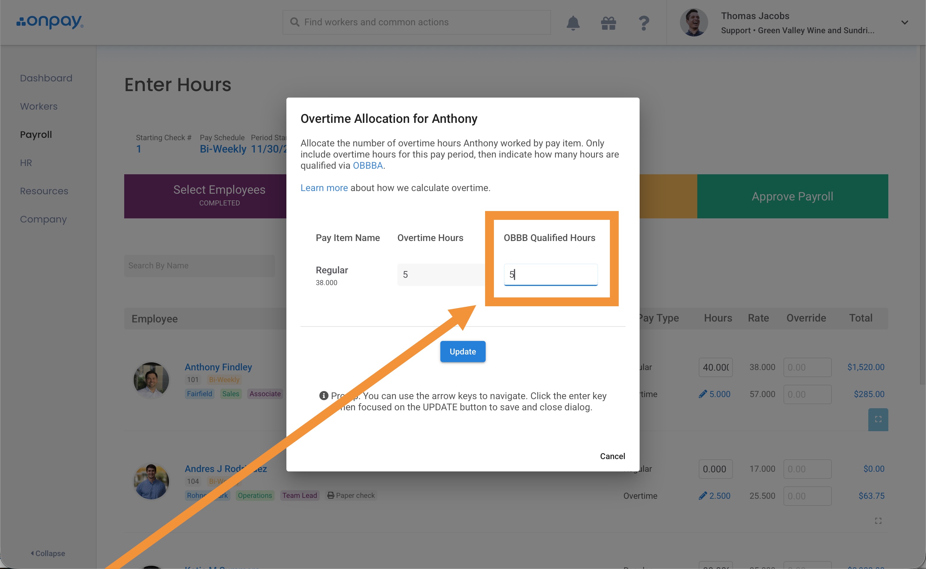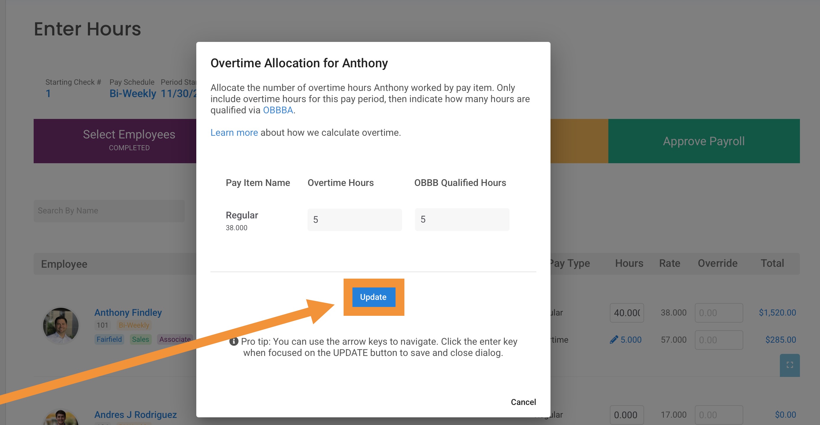 Once the qualified overtime amount has been entered, click Update.