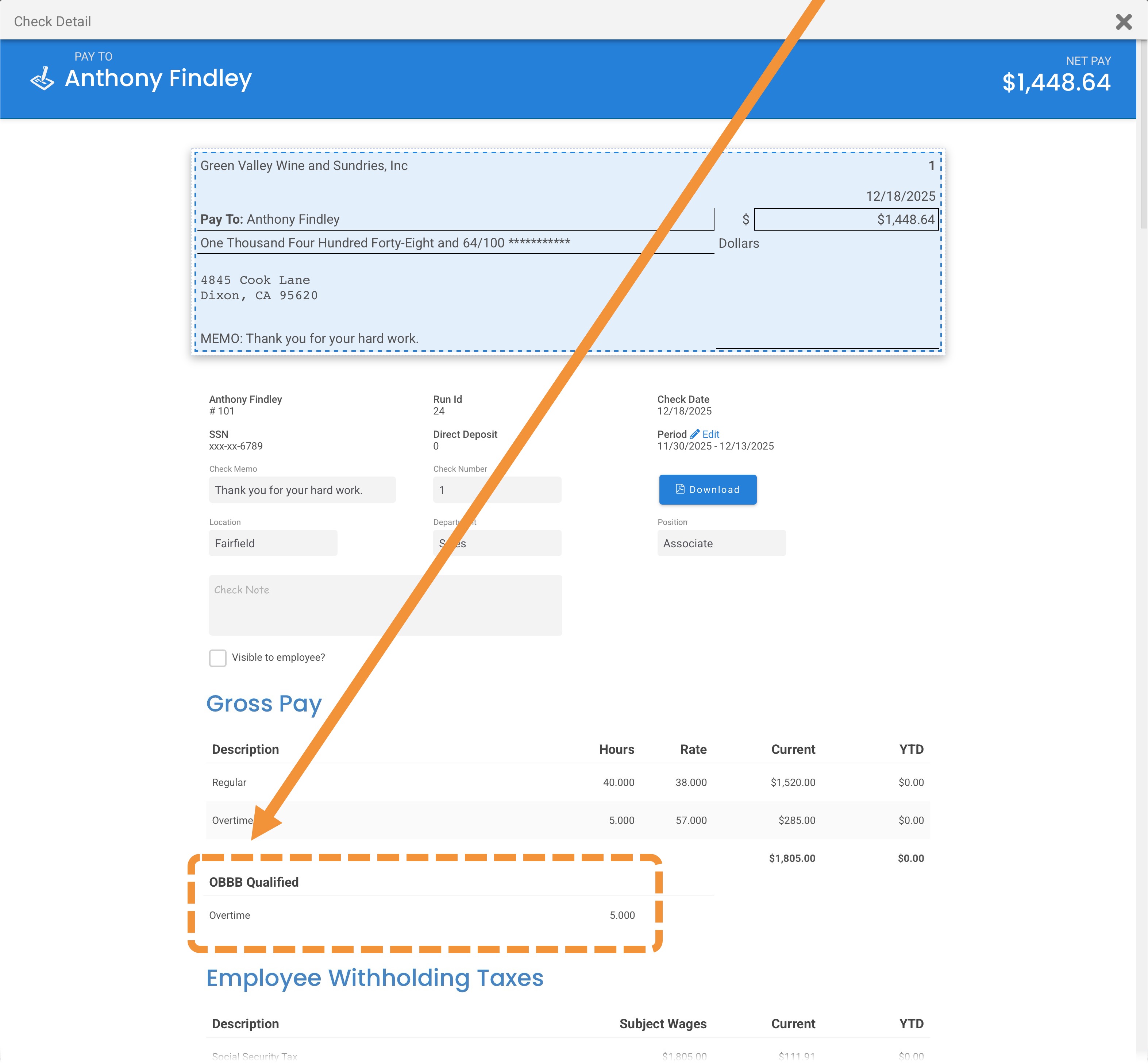 In the above example, Anthony earned a total of 5 overtime hours. The full amount of these hours qualify, and this is reflected by entering the full amount in the "OBBB Qualified Hours" field.Click Preview Check to see how this overtime will appear on their pay stub.