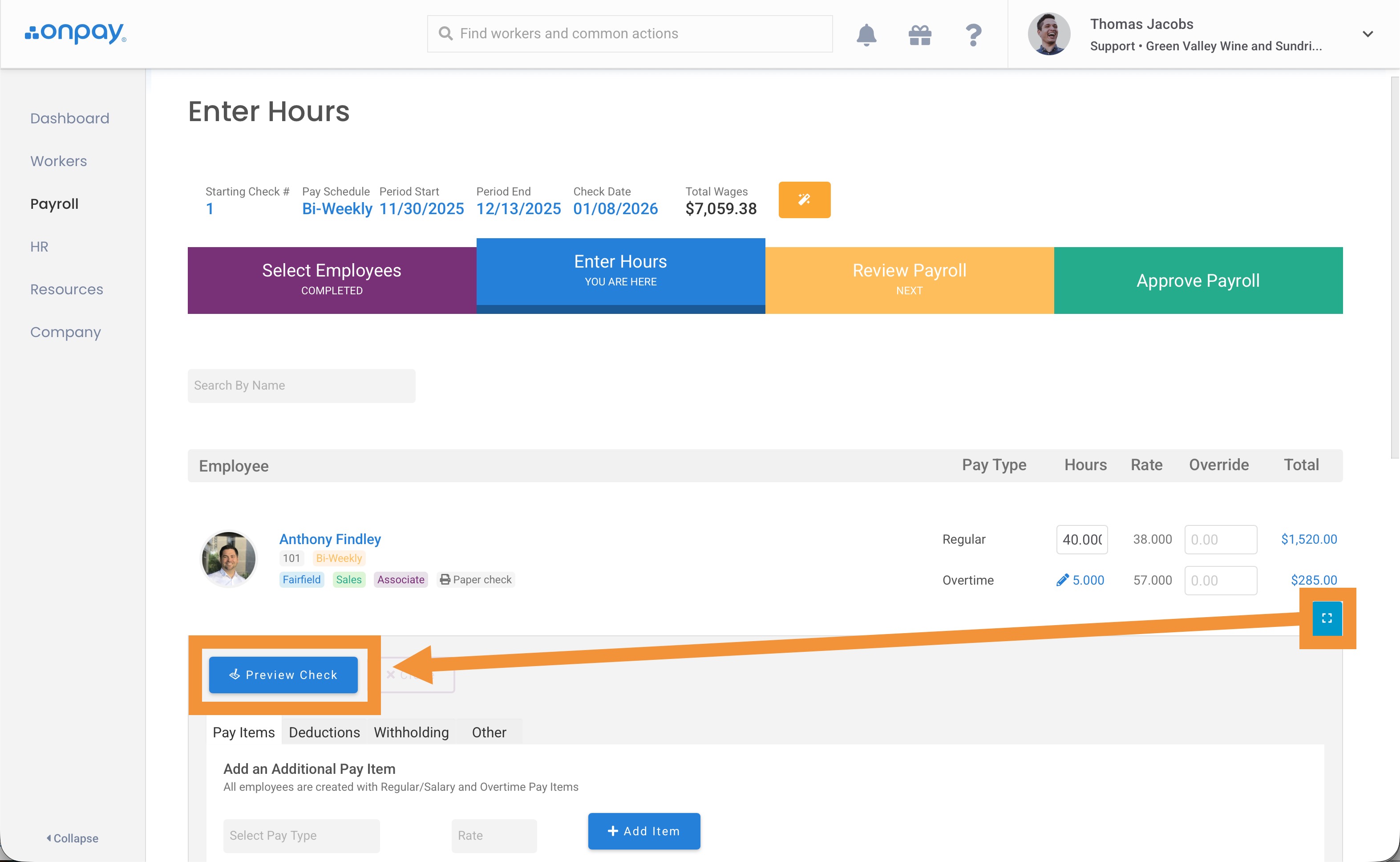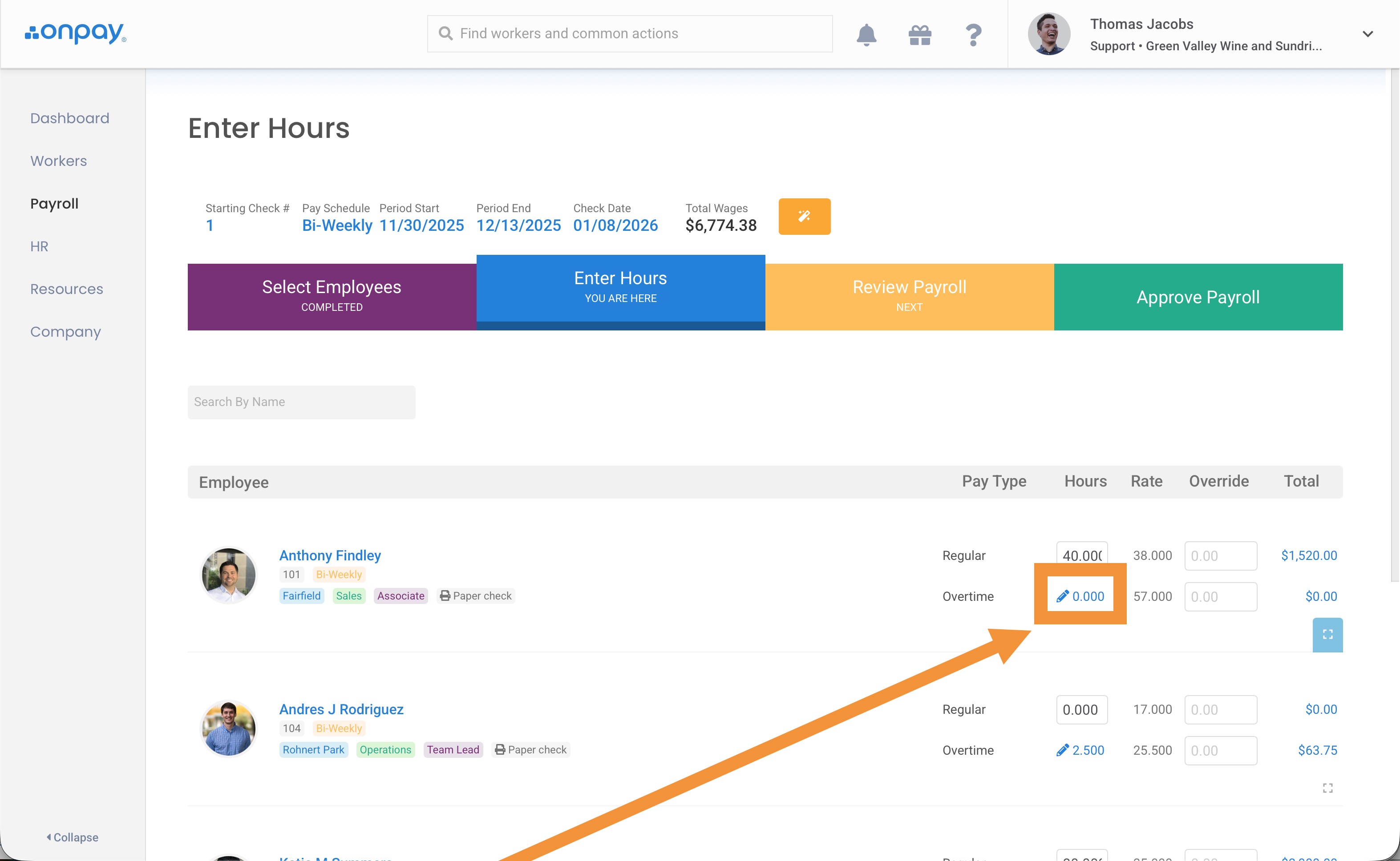 When running payroll, click the edit pencil to enter hours for an employee. If you use integrated time tracking to import hours, you'll still need to enter qualified overtime hours.