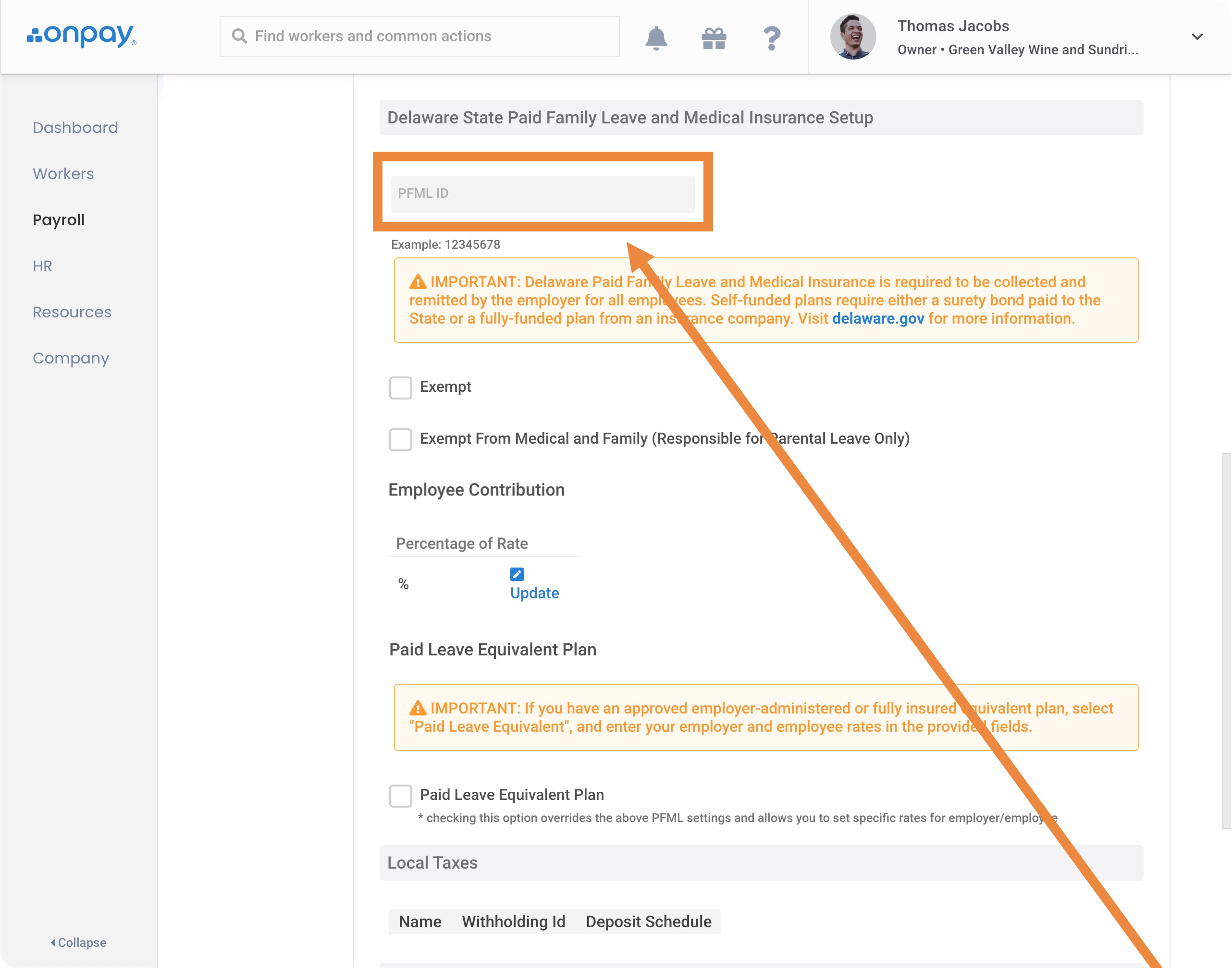 Scroll down to "Washington State Paid Family Leave and Medical Insurance Setup", and enter your PFML ID.